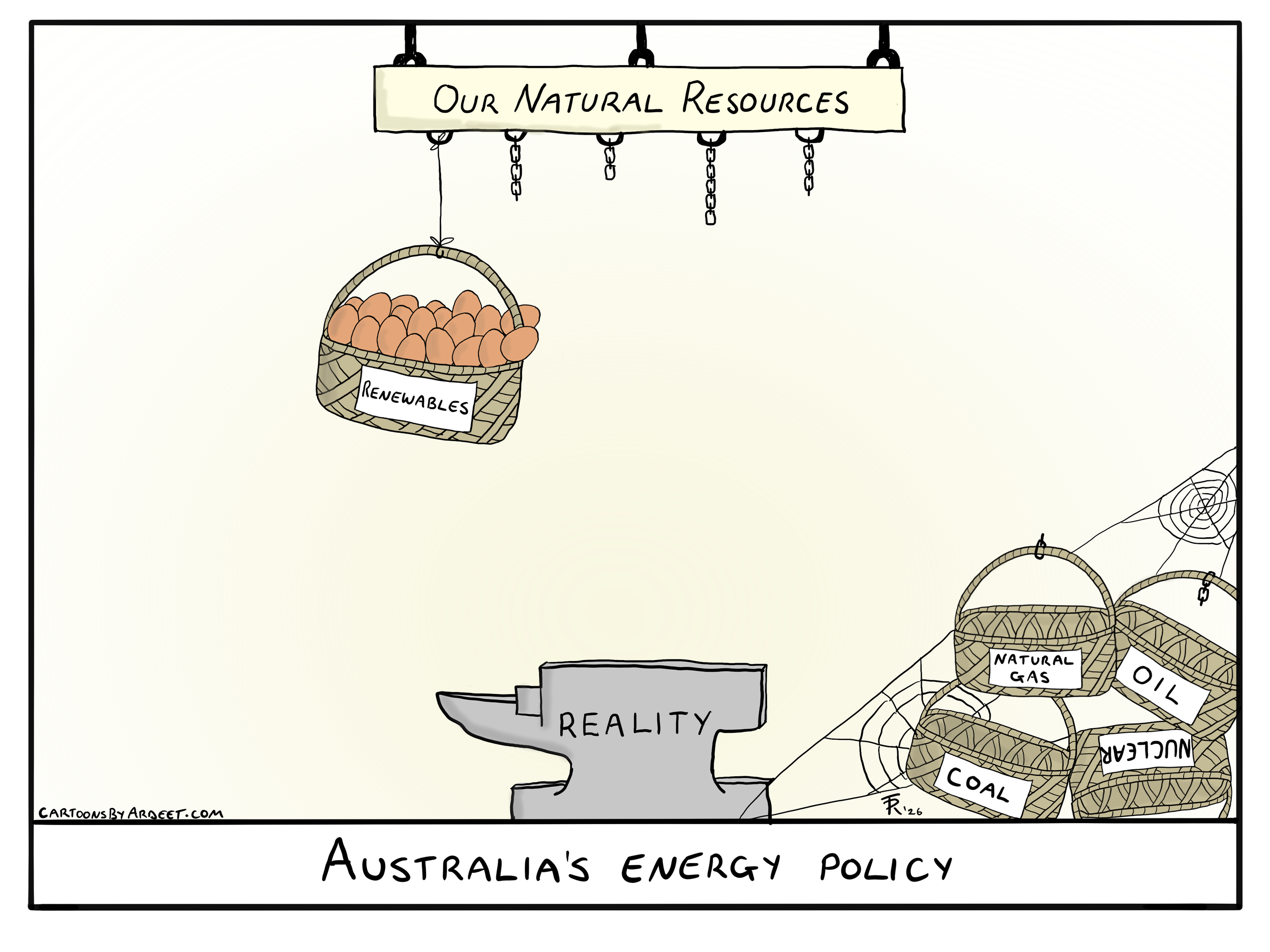 Single frame cartoon. At the top is a sign with rings to hang baskets from. Four of the rings have broken chains. The first ring has a basked full of eggs labelled ‘Renewables’. It is attached by a light piece of string instead of a chain and is slightly tipping over to the right with a couple of eggs teetering. Below it is an anvil labelled ‘Reality’. To the right is a jumbled pile four empty baskets covered in cobwebs. They are labelled ‘Natural Gas’, ‘Oil’, ‘Coal’ and ‘Nuclear. The chyron reads “Australia’s energy policy”.